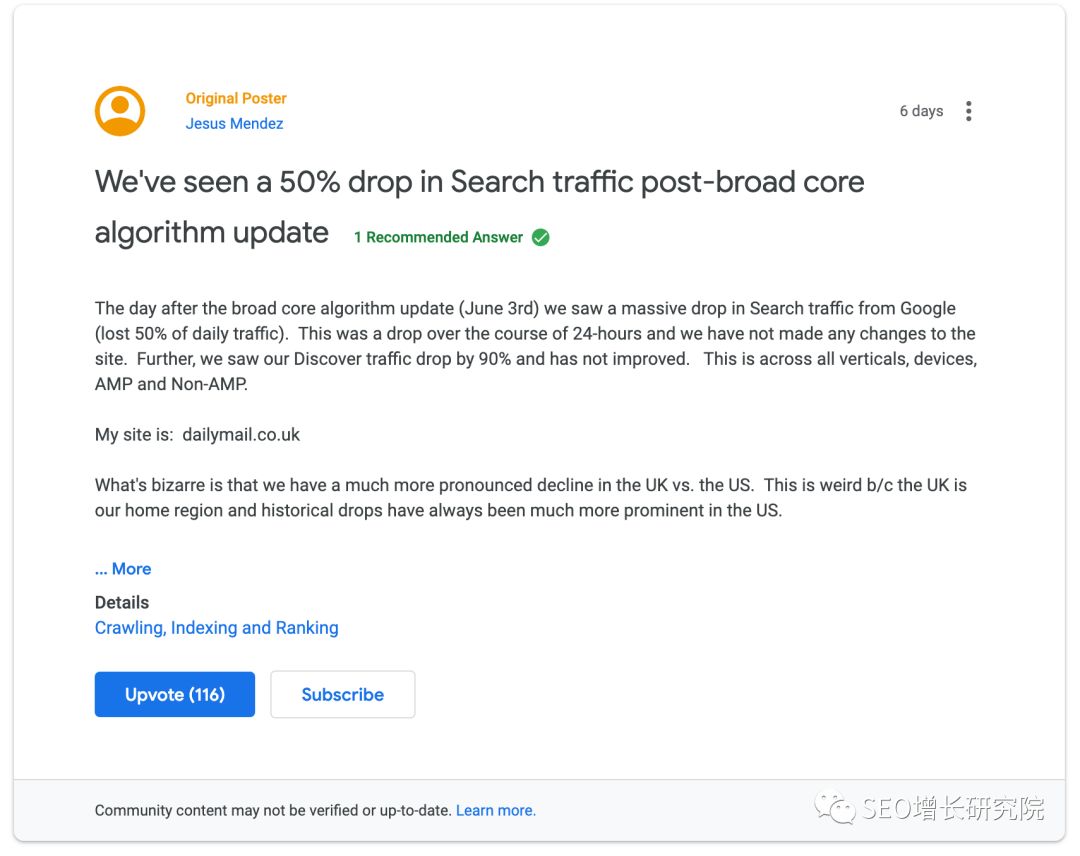 最先发声的是dailymail.co.uk, 在谷歌站长论坛发了一篇贴子,抱怨自己的网站流量下降了50%